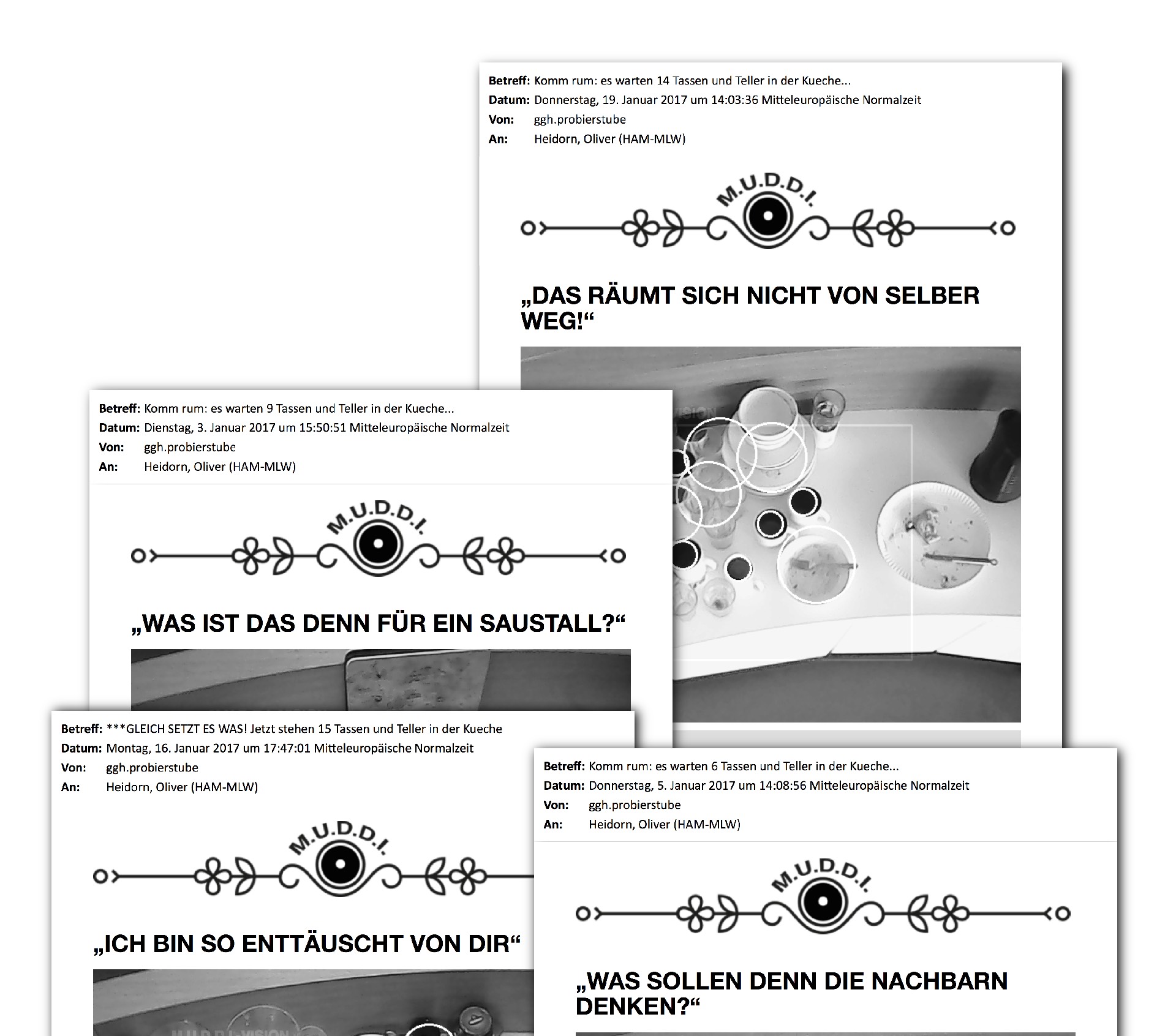 When many people share a kitchen in companies, families, or shared flats, things can quickly get unappetizing. By lunchtime, cups pile up on bowls on plates. That’s when M.U.D.D.I. comes into play. The "Maternal Unit for Dish Detection and Instruction" monitors communal kitchens with a camera eye. Like a real mom, she gets straight to the point: if too many dishes stack up for too long, she sends tough emails to the staff.