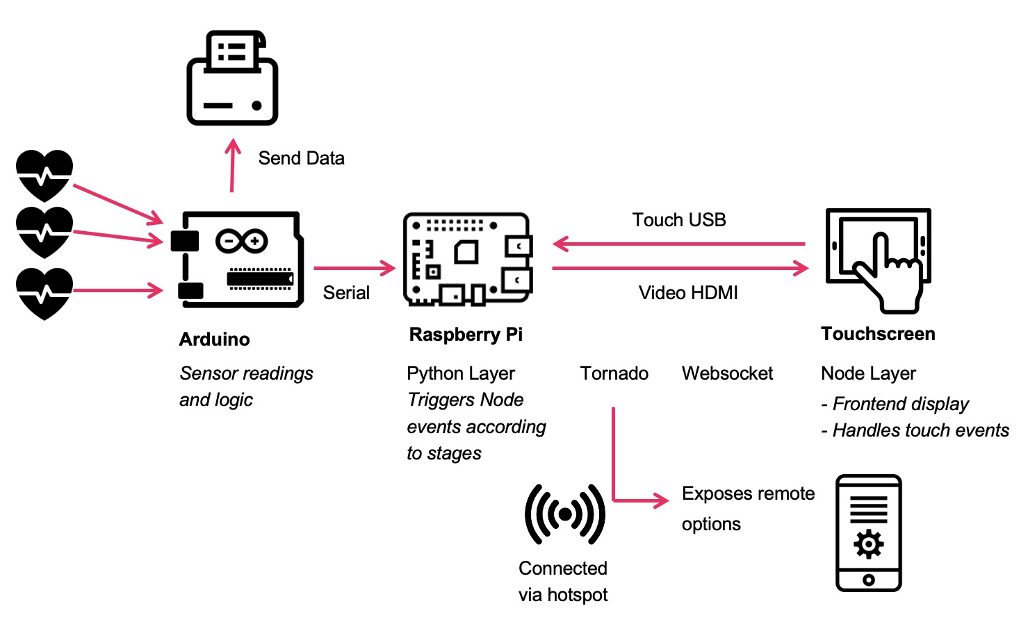 The values are received by a Node server, which prepares them for the Vue frontend. Additionally, a Flask server in the backend provides a page to "orchestrate" the measurements and reactions for filming purposes. If the measurement is successful, the MacMini communicates back to the Arduino board via serial interface. The board then writes image data for a coupon to a small receipt printer.